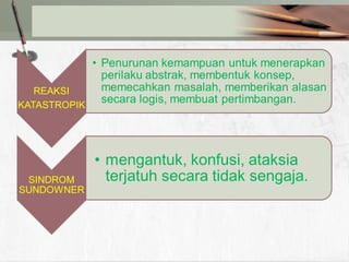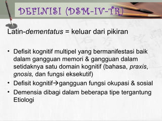 Dokumen ini membahas tentang demensia, termasuk definisi, tipe, epidemiologi, dan etiologi yang berkaitan dengan penyakit. Demensia dapat terjadi akibat berbagai faktor, dengan demensia Alzheimer dan vaskular sebagai jenis yang paling umum. Penyebab dan gejala demensia juga dijelaskan, serta pendekatan terhadap diagnosis dan pengobatan yang relevan.