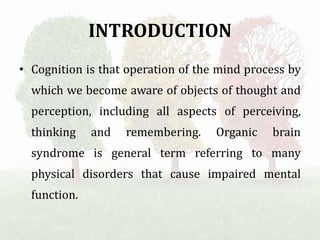 Dementia is a loss of mental skills that affects daily life and usually gets worse over time. It can be caused by neurodegenerative conditions like Alzheimer's disease, vascular diseases, head injuries, strokes, infections, and certain genetic disorders. Dementia is diagnosed through medical history, exams, and lab tests and stages progress from mild cognitive impairment to moderate and severe dementia. Treatment involves medications to address symptoms, care to support daily living, and management of behaviors.