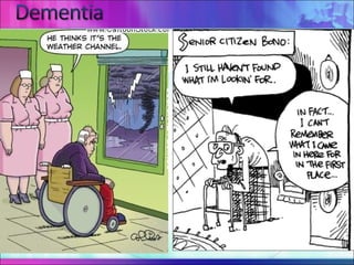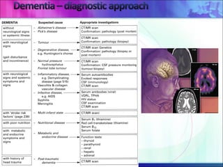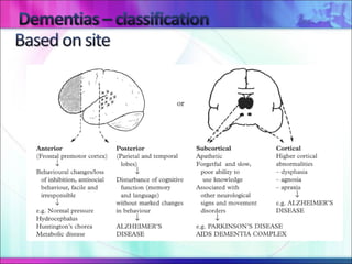 Dementia is a progressive deterioration of intellect, behavior and personality caused by diseases of the brain. The most common causes are Alzheimer's disease (~60% of cases) and cerebrovascular disease (~20% of cases). Dementia is not a single disease but an overall term for loss of brain function. Treatment depends on the underlying cause but currently available medications can only temporarily improve symptoms and do not cure or slow progression. Lifestyle factors may help reduce risk of conditions that can lead to dementia like stroke.