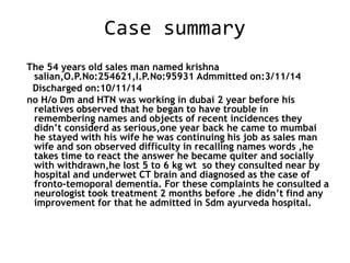 The patient, a 54-year-old male salesman, was admitted to the hospital for complaints of forgetfulness, difficulty recalling names and objects, weight loss, and tiredness. His relatives had observed these issues developing over the past year. Medical tests showed vitamin B12 deficiency and elevated CRP levels. During his hospital stay, Ayurvedic treatments including medications and Panchakarma therapies like nasya and abhyanga were administered. The patient showed gradual improvement in memory, as demonstrated by his increased ability to recall names of visitors and details like what he had for breakfast. He was discharged after successfully recalling most information.
