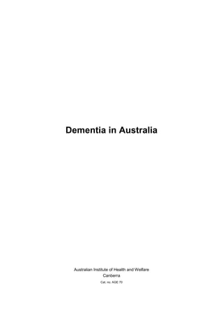 There were an estimated 298,000 Australians with dementia in 2011. This number is projected to nearly triple to around 900,000 by 2050 due to population ageing. Dementia is a leading cause of death and disability in Australia. People with dementia rely heavily on health and aged care services, with total direct expenditure on dementia estimated at $4.9 billion in 2009-10. Many people with dementia have multiple health conditions and require high levels of care. Around 200,000 informal carers of people with dementia living in the community experience substantial demands in their caring role.