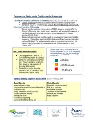 Dementia is a cognitive decline that interferes with daily functioning. It affects memory, language, judgment, and other thinking abilities. Risk increases with age and the presence of vascular risk factors. The prevalence of dementia among those over 65 is 8%, representing a growing challenge. Early screening allows for social and medical benefits like safety planning and earlier treatment. A thorough assessment considers cognitive tests, functional ability, behavioral changes, and input from caregivers to determine if a diagnosis of dementia is appropriate.