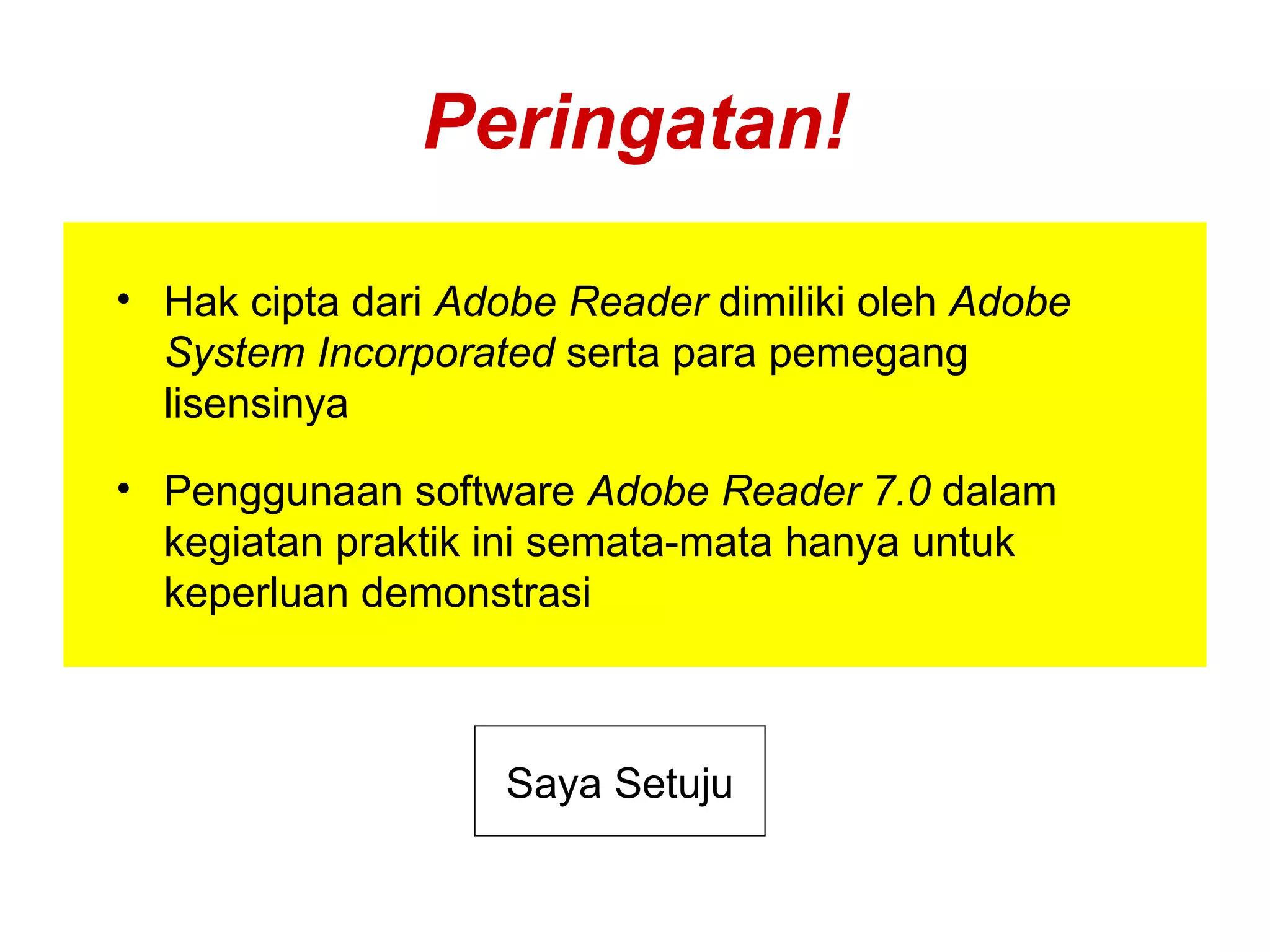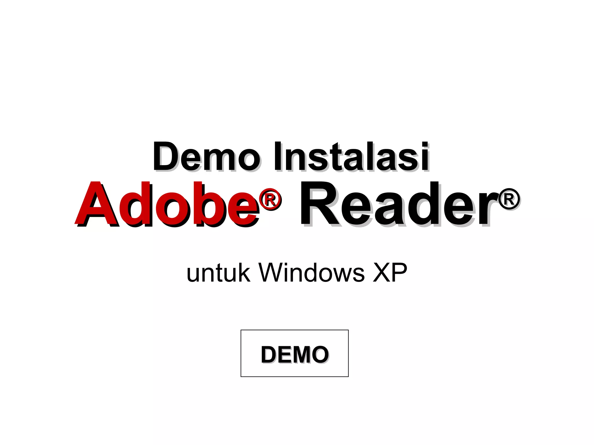 Dokumen ini adalah panduan instalasi Adobe Reader 7.0 pada Windows XP. Proses instalasi dijelaskan langkah demi langkah hingga aplikasi berhasil dipasang dan siap digunakan untuk membuka file PDF. Selain itu, terdapat kuis yang menguji pemahaman pengguna tentang fungsi Adobe Reader dan singkatan PDF.