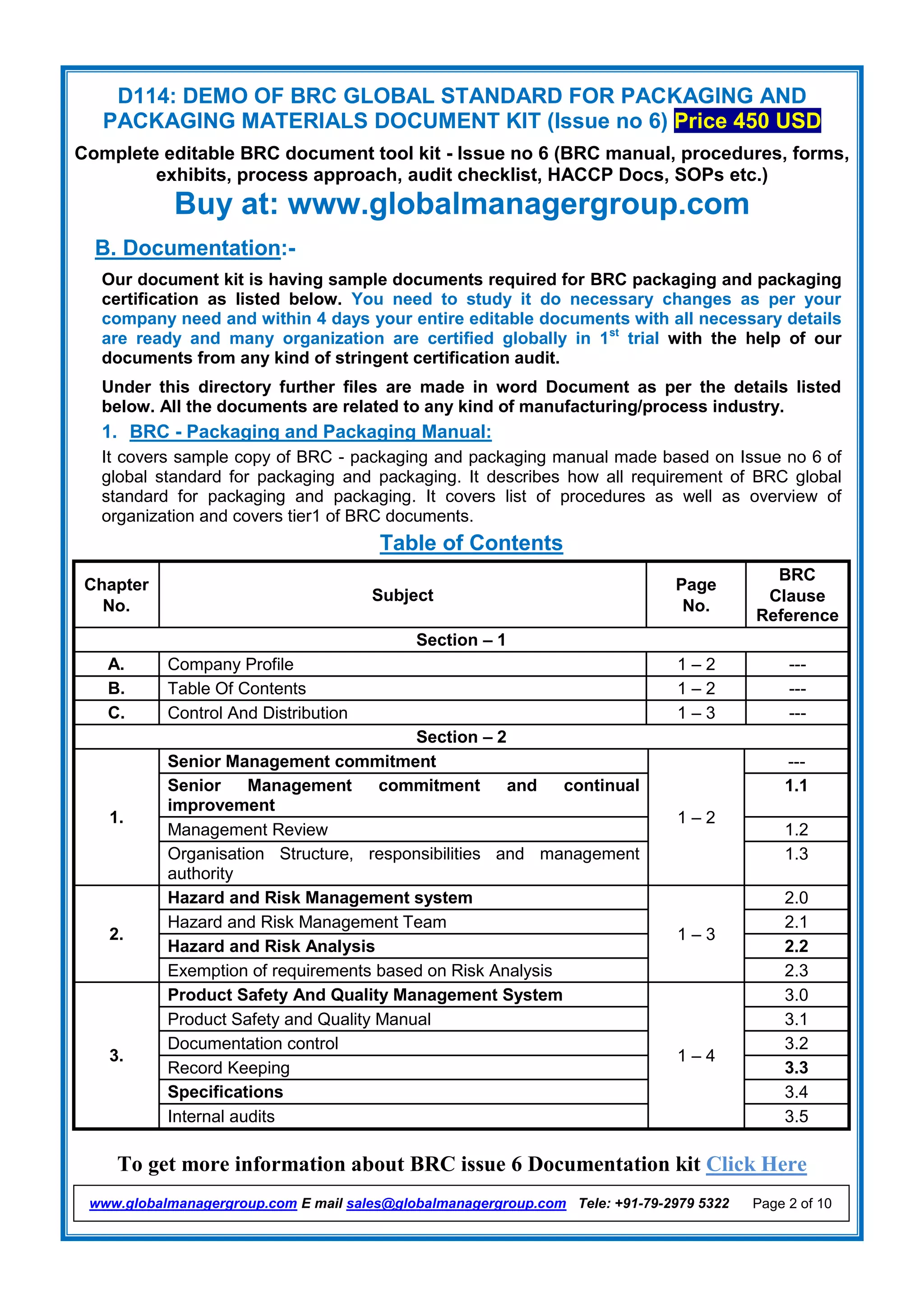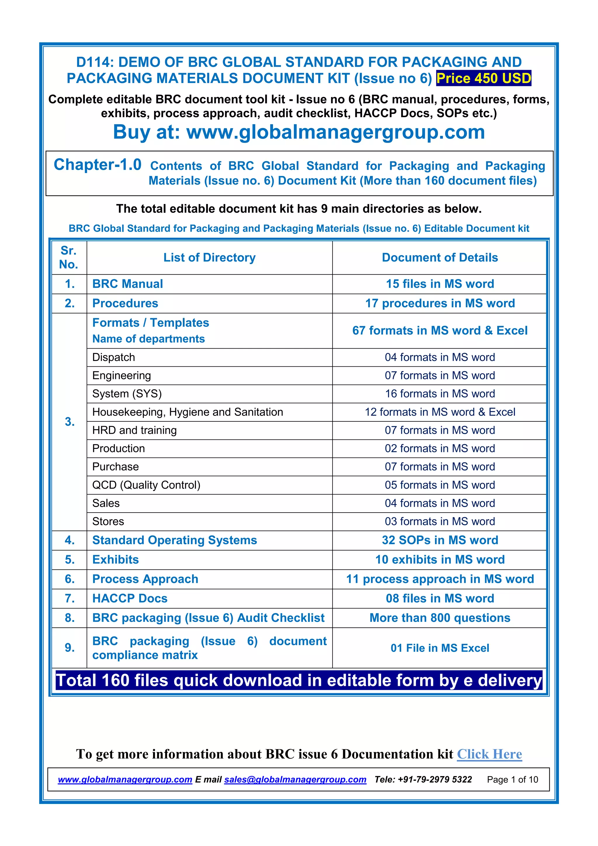 The document introduces a complete editable BRC Global Standard for Packaging and Packaging Materials Document Kit (Issue No. 6) priced at 450 USD, which includes a manual, procedures, formats, SOPs, and audit materials. It provides a comprehensive set of over 160 files to assist companies in achieving BRC certification, tailored for manufacturing industries, and covers critical areas like quality control, HACCP documentation, and operational procedures. Additionally, the Global Manager Group, noted for its extensive experience and success in ISO/BRC consultancy, offers this adaptable toolkit to streamline compliance and certification processes for organizations worldwide.