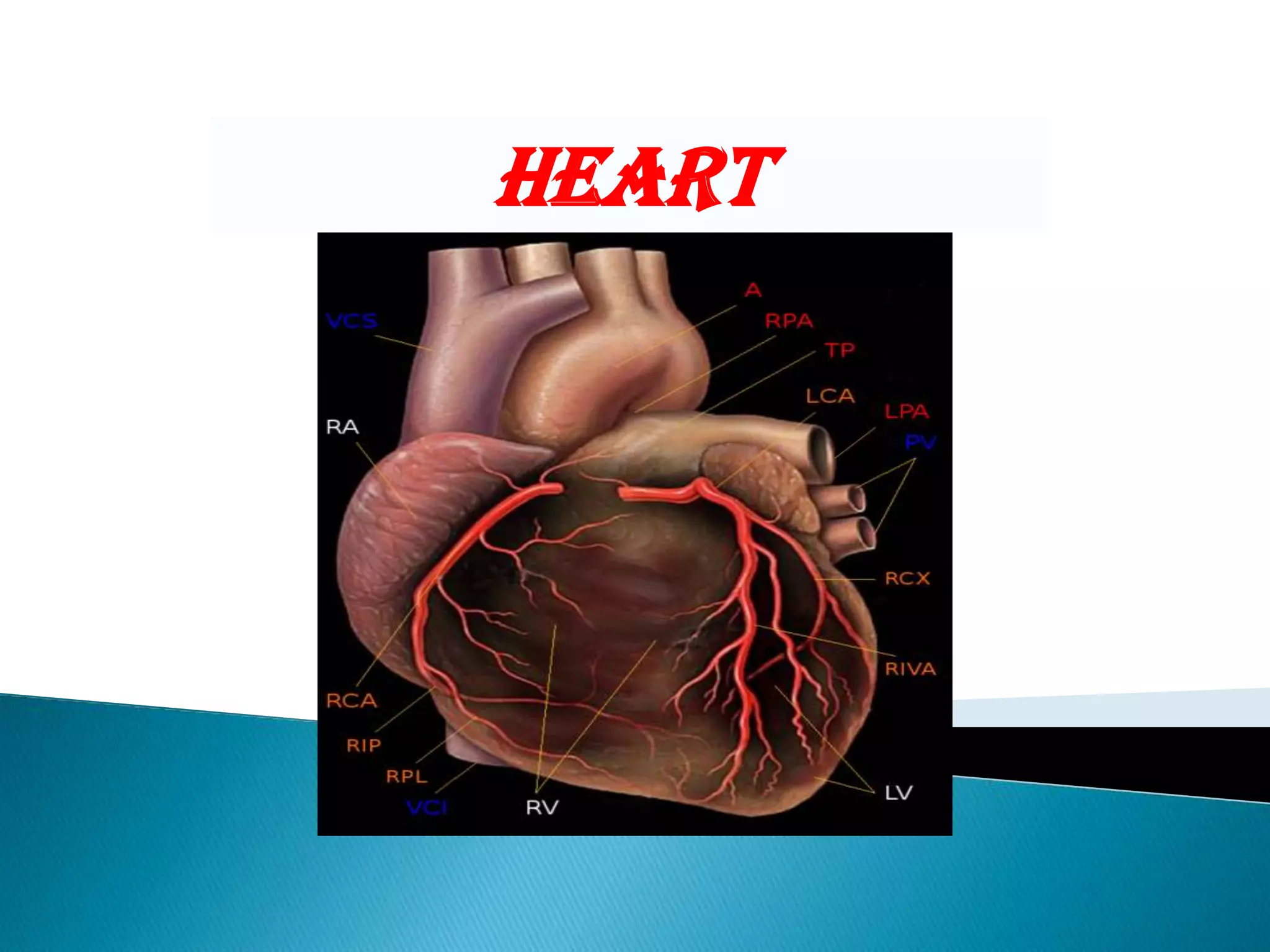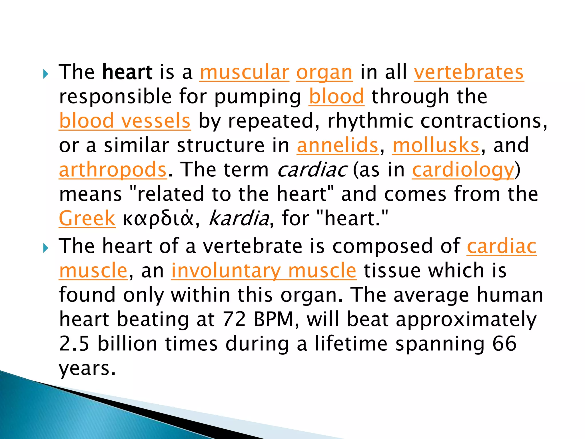 The heart is a muscular organ that pumps blood through the circulatory system. It has four chambers and is located slightly left of center in the chest. The two upper chambers are called atria, which receive blood, and the two lower chambers are called ventricles, which pump blood out of the heart. The right side receives deoxygenated blood and pumps it to the lungs, while the left side receives oxygenated blood from the lungs and pumps it out to the body. Valves ensure blood flows in only one direction through the heart.
