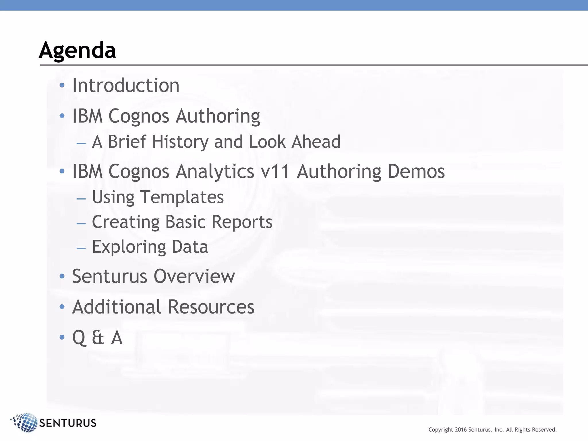 The document discusses report authoring in IBM Cognos Analytics v11, highlighting its evolution, migration concerns for existing authors, and the transition to a modern user experience. It also emphasizes the importance of ongoing learning and training, offering resources and upcoming courses for experienced users to stay updated on new features. Senturus provides a variety of additional resources, including webinars and demos, to support users in their reporting and analytics journey.