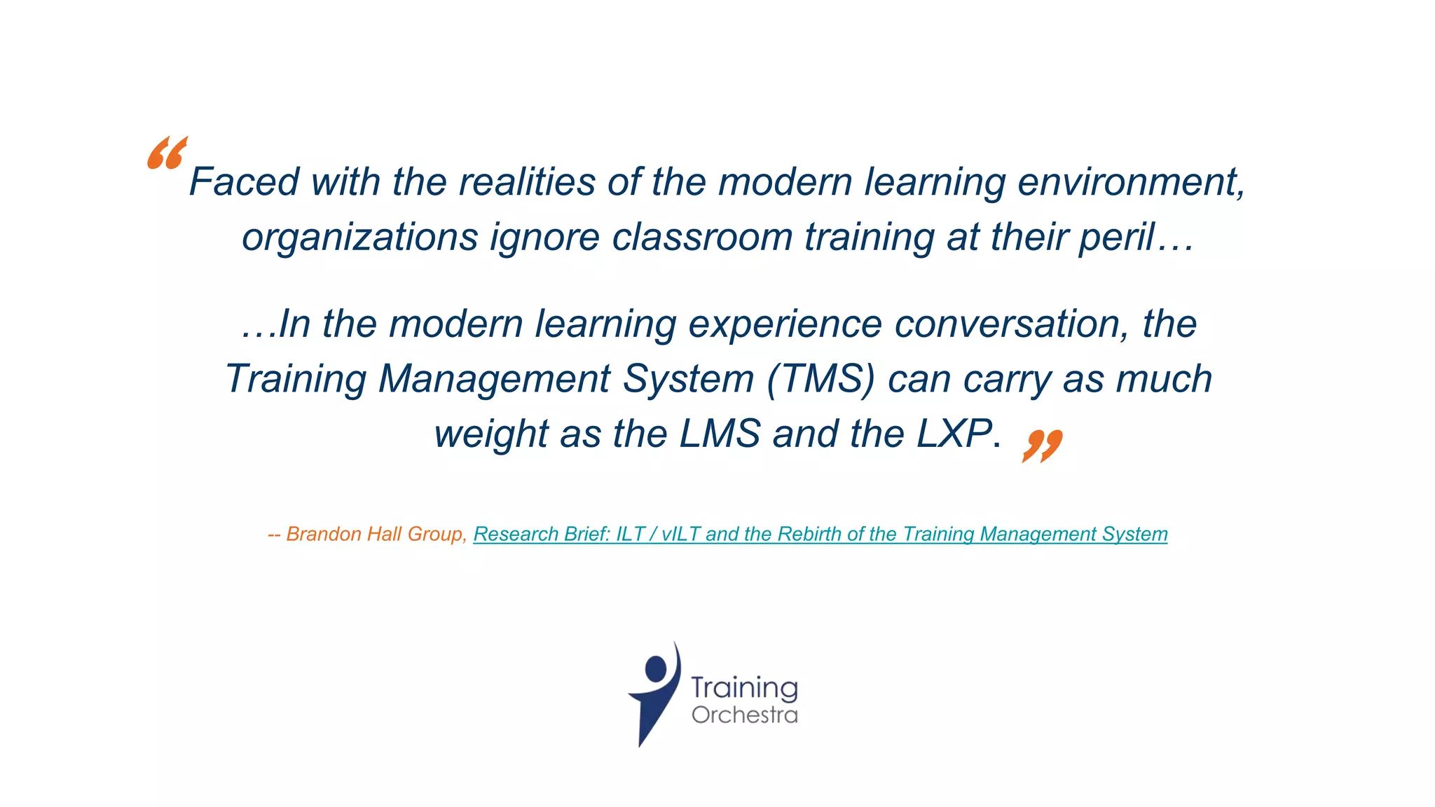 The document discusses the importance of adopting a Training Management System (TMS) to enhance the efficiency of training operations in organizations, especially those involved in instructor-led and virtual instructor-led training. It highlights key trends in the training industry, including the growth of ILT/VILT, the need for better resource management, and the shift from cost centers to profit centers. Training Orchestra offers a robust TMS that helps organizations optimize scheduling, improve resource utilization, and track performance metrics effectively.