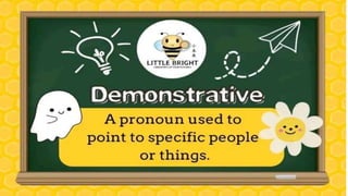 This document discusses demonstrative pronouns. It defines demonstrative pronouns and lists the common demonstrative pronouns - this, that, these, those - along with their uses based on proximity to the speaker. The learning objectives are to define demonstrative pronouns, use them effectively, and understand their significance. Examples of using demonstrative pronouns in statements are provided, as well as an assignment with a multiple choice activity to practice using the correct demonstrative pronoun.