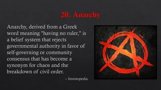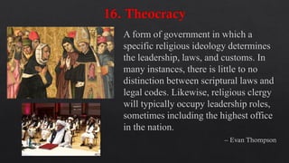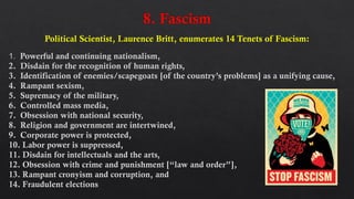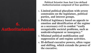 The document discusses various forms of governance and societal structures, contrasting democracy with autocracy and noting the influence of ideologies like white supremacy and patriarchy. It references historical figures and systems, including Draco's legal reforms in ancient Greece and the impact of U.S. policies on figures like Hitler. Additionally, it enumerates instances of systemic oppression and authoritarian regimes throughout history.