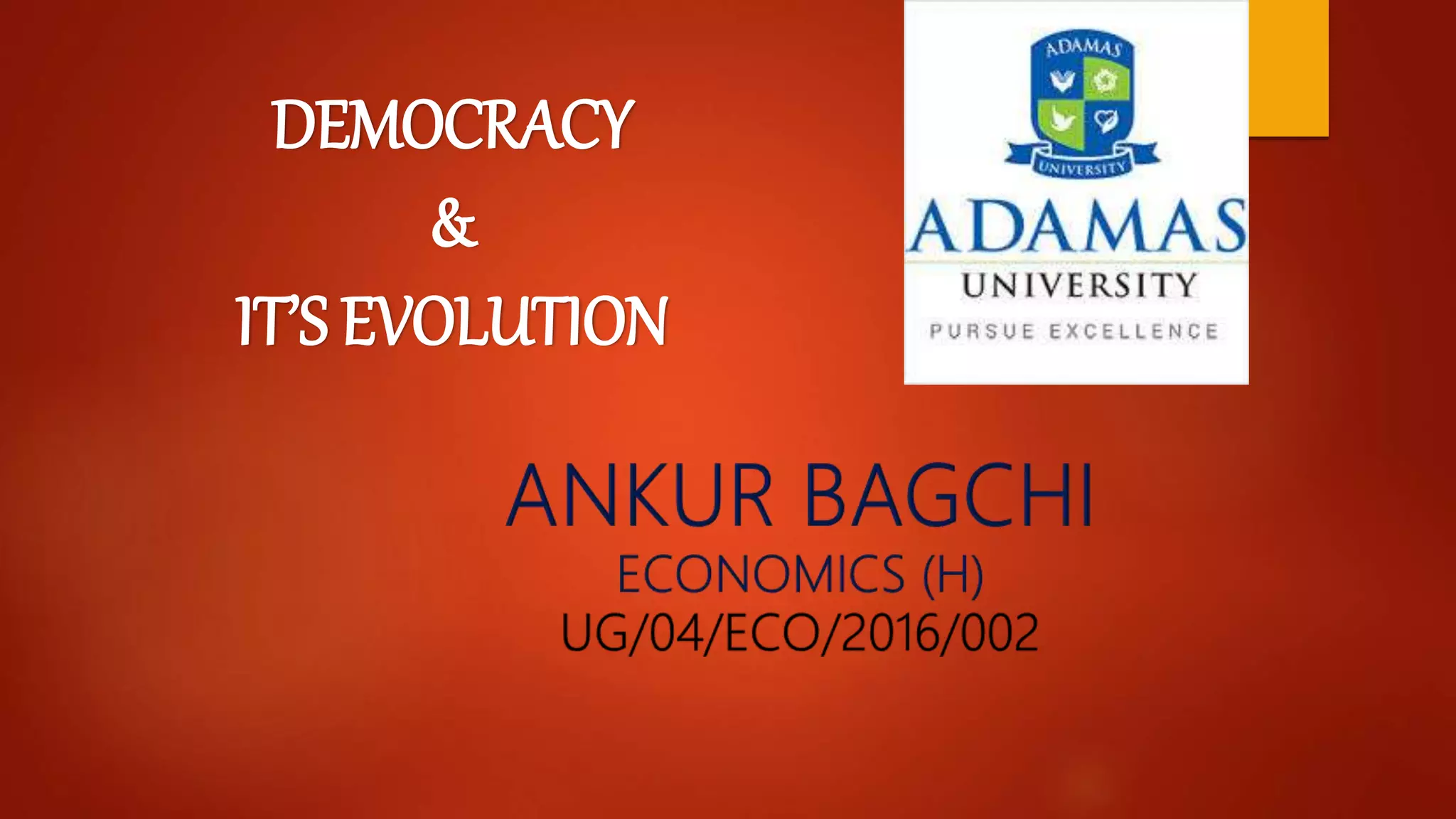 Democracy originated in ancient Greece, where citizens of Athens were first given access to government offices and courts. Throughout history, most societies have not been democratic, with rulers gaining power through inheritance or military force. Modern democracy developed in the 20th century as democratic governments spread following wars, revolutions, and decolonization. Today around 60% of the world's nations are democratic, though weaknesses like instability, delays in implementation, and potential for corruption remain challenges.