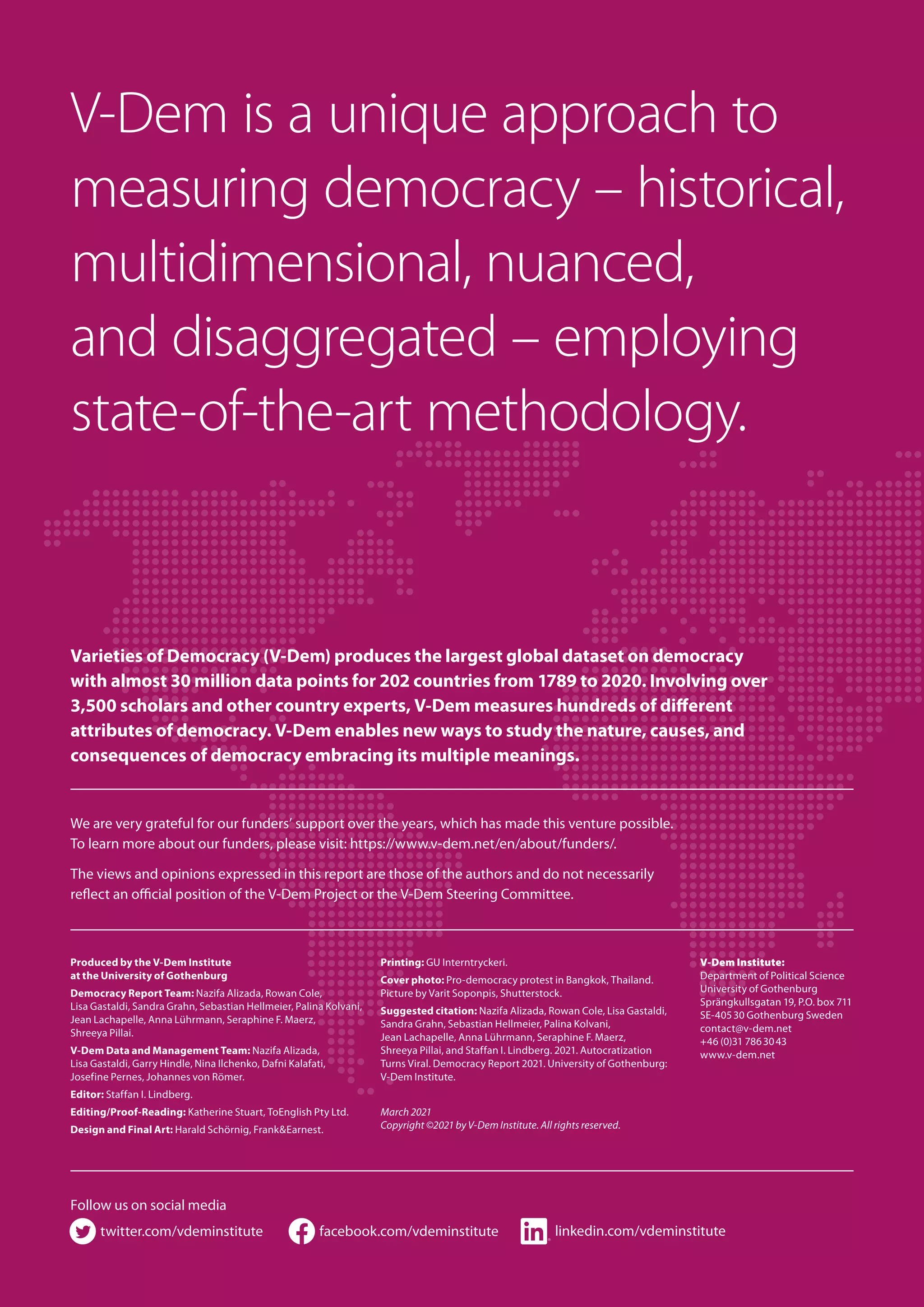 The Democracy Report 2021 by the V-Dem Institute highlights a continuing global decline in liberal democracy, exacerbated by the COVID-19 pandemic, with significant violations of rights by both democratic and autocratic regimes. As of 2020, the average citizen experiences levels of democracy comparable to those of 1990, while autocratic governance now encompasses 68% of the world's population. Despite dire trends, there are indications of resilience in pro-democracy movements, although threats to freedom of expression are intensifying.