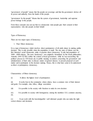 The document discusses the concepts of democracy and democratic processes and practices. It defines democracy as a system of government where power belongs to the people. It outlines the historical development of democracy from ancient Greece and the types of democracy, including direct/pure democracy and indirect/representative democracy. It also discusses the principles/features of democracy, types of representative democracy, local government in Tanzania and the role of government in democratic processes.