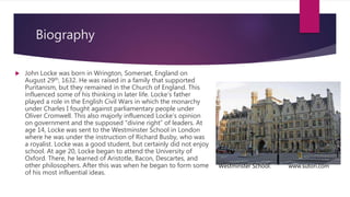 John Locke was an English philosopher born in 1632 who had a significant influence on politics and government. He grew up during the English Civil Wars and was educated at Westminster School and Oxford University. Locke developed ideas about natural rights and the social contract theory of government, believing that people consent to governments in order to protect their rights to life, liberty, and property. He wrote influential works like Two Treatises of Government that the American founders drew from to develop democratic principles like the right to revolution. Locke's ideas about consent of the governed and inalienable rights continue to influence modern politics and debates over civil liberties.