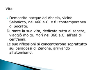 Democrito (460 a.C.-360 a.C.) fu un filosofo greco che sviluppò la teoria atomica, sostenendo che la realtà fosse composta da atomi, che sono eterni, immutabili e in movimento. Distinse tra conoscenza sensibile e razionale, e negò l'esistenza di Dio, proponendo una visione meccanicistica e deterministica del mondo. Le sue idee affrontarono i paradossi di Zenone, contribuendo a un approccio materialista e laico nella filosofia.