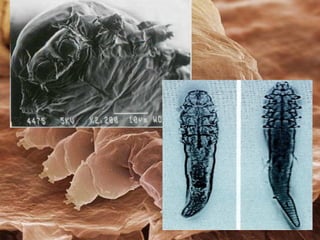 This document discusses demodicosis, a skin condition caused by the mites Demodex folliculorum and Demodex brevis. It provides details on the biology and life cycle of the mites, including that they live in hair follicles and sebaceous glands, feeding on epithelial cells. Clinical features include pimples and rashes on the face and eyes. Treatment involves peeling, antiparasitic ointments containing sulfur or other agents, and addressing any contributing factors like an unhealthy diet or disrupted skin barriers. The mites are commonly found on humans and may be involved in exacerbating conditions like rosacea, but more research is still needed to fully understand their role in disease pathogenesis.
