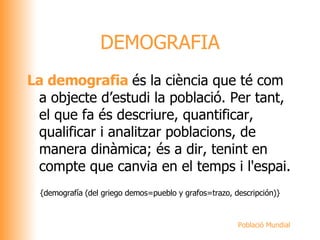 DEMOGRAFIA La demografia és la ciència que té com a objecte d’estudi la població. Per tant, el que fa és descriure, quantificar, qualificar i analitzar poblacions, de manera dinàmica; és a dir, tenint en compte que canvia en el temps i l'espai. {demografía (del griego demos=pueblo y grafos=trazo, descripción)} Població Mundial