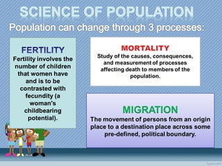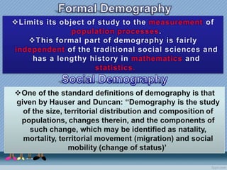 Demography is the statistical study of human populations and how they change over time or space. It involves analyzing the size, structure, and distribution of populations, as well as changes in populations due to birth, migration, aging, and death. Demography is important for sociology and other social sciences because all social groups are populations that change in size, location, and characteristics over time, impacting cultures, economies, politics, and societies. Demographers study overall population size, territorial distribution of populations, and population composition.