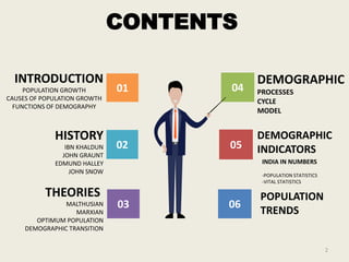 Demography is the scientific study of human populations. Key events in the history of demography include Ibn Khaldun's work in the 14th century, John Graunt producing the first life table in the 17th century, and John Snow mapping cholera deaths in London in the 19th century. Major population theories include Malthus' theory of unchecked population growth outstripping resources, Marx's view that population is controlled by economic factors, and the demographic transition theory of declining birth and death rates as countries develop. India's current population is over 1.2 billion with a growth rate of 17.6% in the last decade. Key demographic indicators of India include sex ratio, age composition, and dependency ratio.