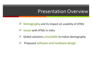 This document discusses how demography impacts the usability of automated teller machines (ATMs) in India. It notes that India has a large population with diverse languages, literacy rates, age distributions, and levels of technical experience. As a result, existing ATM designs from other countries are often unsuitable for the Indian demographic. The document then outlines several hardware and software issues Indian users experience with ATMs. It proposes an updated ATM design with features like a privacy screen, intuitive card slot, touchscreen interface, and localization of the interaction flow. Research found this proposed design improved usability. The conclusion advocates for customizing technologies to diverse demographics.