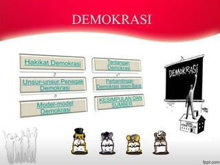 Pemerintahan demokrasi adalah pemerintahan yang didasarkan pada prinsip dari rakyat, oleh rakyat, dan untuk rakyat. Terdapat beberapa model demokrasi seperti liberal, terpimpin, sosial, partisipasi, dan konsosiasional. Ada perbedaan pandangan antara demokrasi Islam dan Barat, namun juga terdapat persamaan. Tantangan demokrasi di Indonesia adalah belum matangnya demokrasi, multi partai yang rentan instabilitas, s