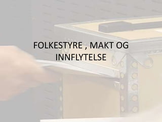 PåvirkningGrunnloven av 1814sier at det er folket som bestemmer hvem som skal styre landet.Folket velger representanter til Stortinget, Sametinget, fylkestinget og kommunestyret.Representantene kommer fra ulike politiske parti.En valgperiode er på fire år.Det er valg hvert annet år.