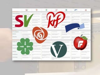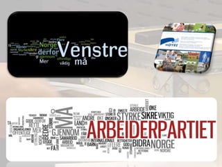 Ulike partierDet erulike verdier og interesser som skaper forskjeller mellom partier. Det er:Økonomi og arbeidsliv.Religiøse og moralske spørsmål.Motsetninger mellom by og land.Naturvern og miljø.Utdanning og helsepolitikken.