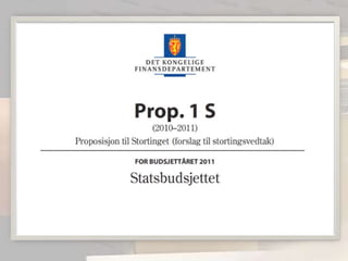 Hver høst leggerregjeringen fram et forslag om statsbudsjett.Her har de satt opp inntekter og utgifter som man tror staten vil få i løpet av et år.I statsbudsjettet blir det bestemt hvor mye penger som skal brukes på skole, helse, forsvar etc.Statsbudsjettet kalles også for Stortingsproposisjon nr. 1.