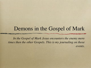 The document discusses various passages from the Gospel of Mark that involve Jesus encountering demons. Some key points: