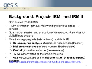 This document describes a framework for knowledge organization system (KOS)-based recommendation systems. It discusses two funded projects (IRM I and IRM II) that aimed to implement value-added information retrieval services for digital libraries based on applying scholarly models. These services include term suggestion, query suggestion, and bibliometric analysis. The document outlines the Information Retrieval Service Assessment (IRSA) component, which calculates search term suggestions using co-occurrence analysis of controlled vocabularies harvested via OAI-PMH. It demonstrates the IRSA system and discusses limitations and references.