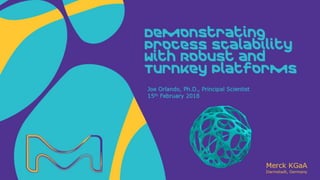 Joe Orlando presented on Merck KGaA's platforms for robust and scalable upstream bioprocess development. Their CHOZN GS expression system provides a stable recombinant cell line, optimized media and feeds, and single-use bioreactors to efficiently develop and scale processes from shake flasks to 50L bioreactors. Using their TNFR Fc-fusion protein as an example, Merck demonstrated consistent titers, glycan profiles, and low aggregates across scales. Their turnkey solution aims to reduce development time and improve product quality and consistency throughout the upstream process.