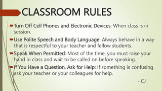 The document contains classroom rules for students which include turning off electronic devices during class, using polite speech and body language, speaking only when permitted by raising your hand, and asking for help if confused by asking the teacher or other students. It also contains an agenda for a presentation on disaster readiness and risk reduction which includes reviewing important elements of the fire triangle, causes of fire incidents, proper use of fire extinguishers, and actions to take in a fire. The presentation identifies different types of disasters in pictures such as fires, volcanic eruptions, earthquakes, floods, and defines key terms like disaster, storm surge, natural disasters, and classifications of disasters as natural or human-made.