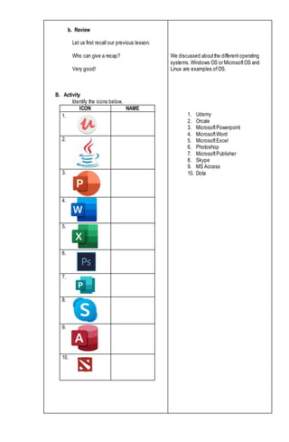 The document outlines a demonstration lesson plan in ICT focused on installing and configuring computer systems. It includes objectives, subject matter covering application software, a series of teacher and student activities, and evaluation methods. Additionally, it highlights various types of application software with examples, culminating in group-based software installation tasks and an assignment on utility software.
