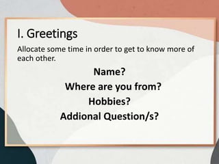 II. Students read definitions of vocabulary words like "south", "literature", and "originally". They then read a dialogue between Ryan and Jaime where they introduce themselves and ask each other what country and part of a country they are from.