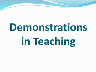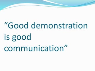 Demonstration is an effective instructional method for visually explaining facts, ideas, or processes using various media like photographs, drawings, films or guided motions. Effective demonstrations establish rapport with students, avoid assumptions that concepts are clearly understood, and focus on key points where errors are likely to be made. The document discusses the principles of using demonstration as a teaching tool, highlighting the importance of good communication through visualization.