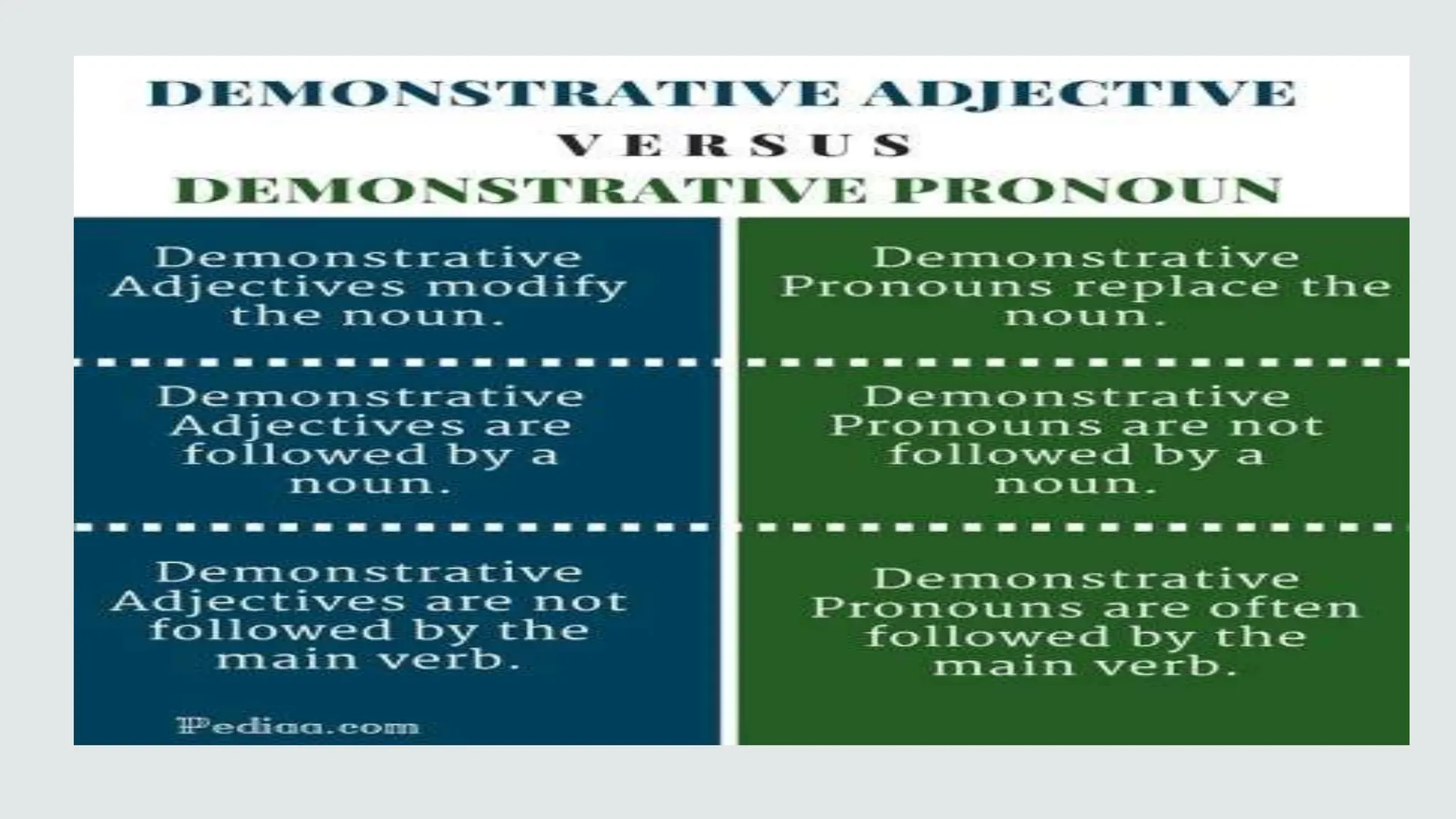 The document outlines the learning objectives regarding demonstrative adjectives and pronouns, specifically naming the four types and explaining their purpose. It emphasizes the importance of using these words with correct subject-verb agreement. Additionally, it references a textbook exercise on page 17 for practice.