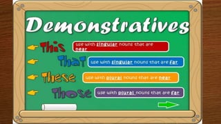 We use demonstrative pronouns and demonstrative adjectives to point out specific people, things, or places. Demonstrative pronouns include this, these, that, and those and change the verb to singular or plural form. Demonstrative adjectives also include this, these, that, and those and must agree in number with the noun they modify. Both demonstrative pronouns and adjectives are used to identify particular items.