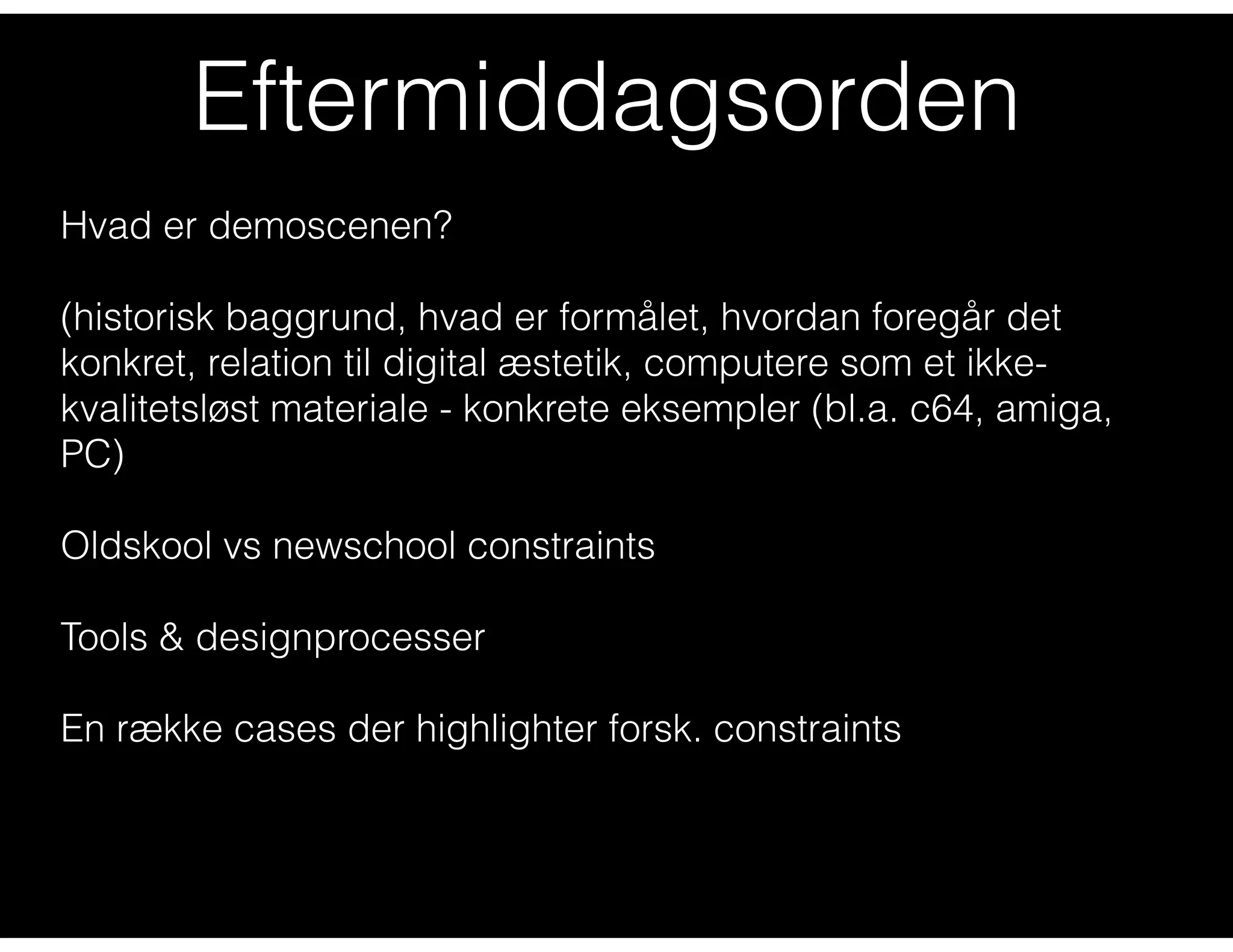 This document discusses the demoscene, a computer art subculture focused on creating short demos or demonstrations of programming skill and audiovisual design. It explores the history and evolution of the demoscene from its origins on platforms with hardware constraints like the Commodore 64 to modern demos with self-imposed constraints. Key aspects covered include the motivations of competition, technical challenge, and socializing; constraints related to platforms, file sizes, and visual styles; and the progression of graphics and music capabilities within the demoscene from early platforms to modern tools. Examples of notable recent demos are provided to illustrate the creative approaches and aesthetics within the newschool demoscene.