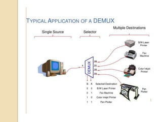 A demultiplexer is a device that takes a signal containing multiple data streams and reconstructs the original separate streams. It works in reverse of a multiplexer, which combines multiple streams into one signal. Demultiplexers come in various types depending on the number of select lines, which determine how many output streams they can separate the combined signal into, from 1-to-2 up to 1-to-16. Common applications of demultiplexers include communication systems and converting serial to parallel signals.