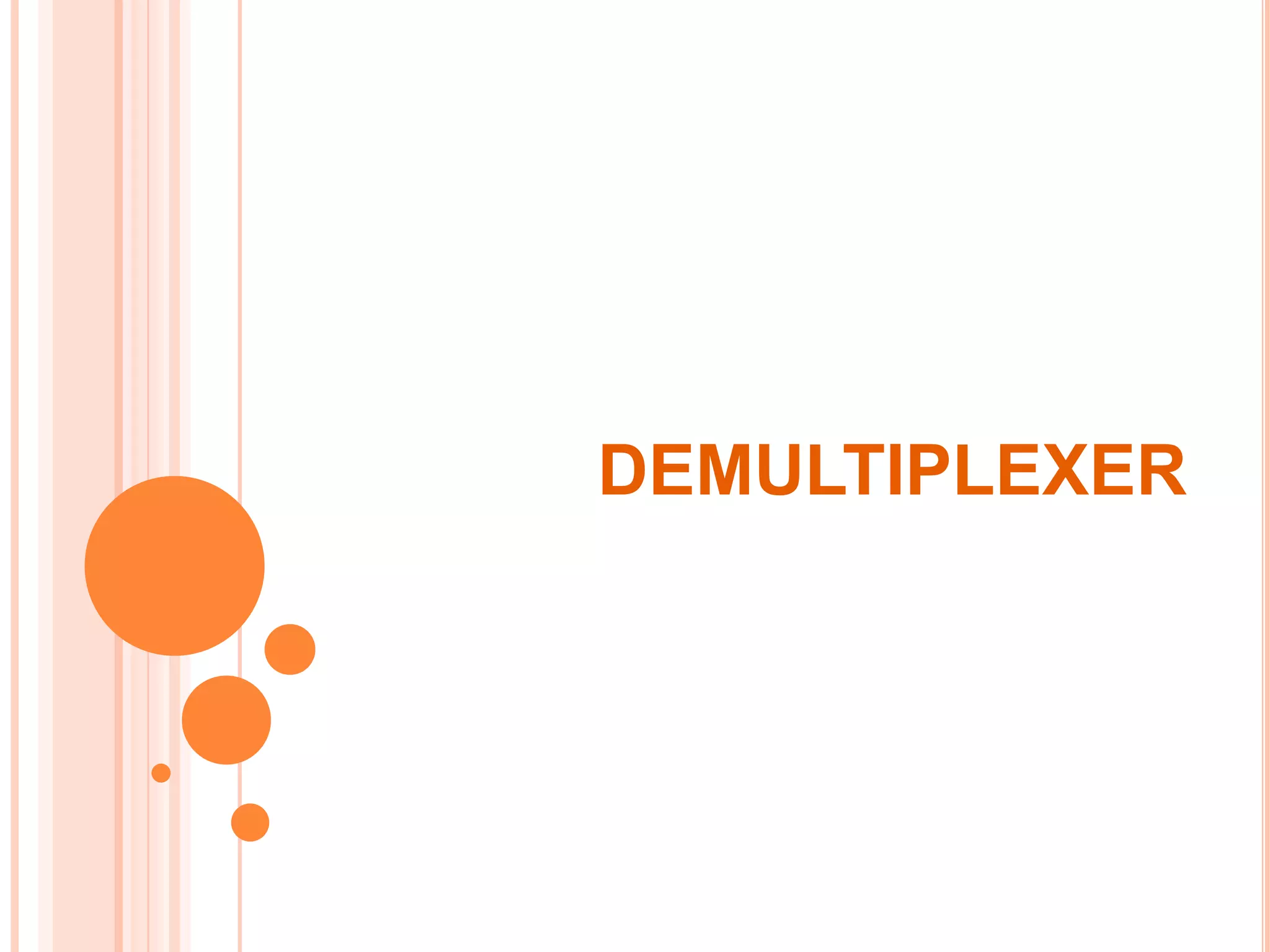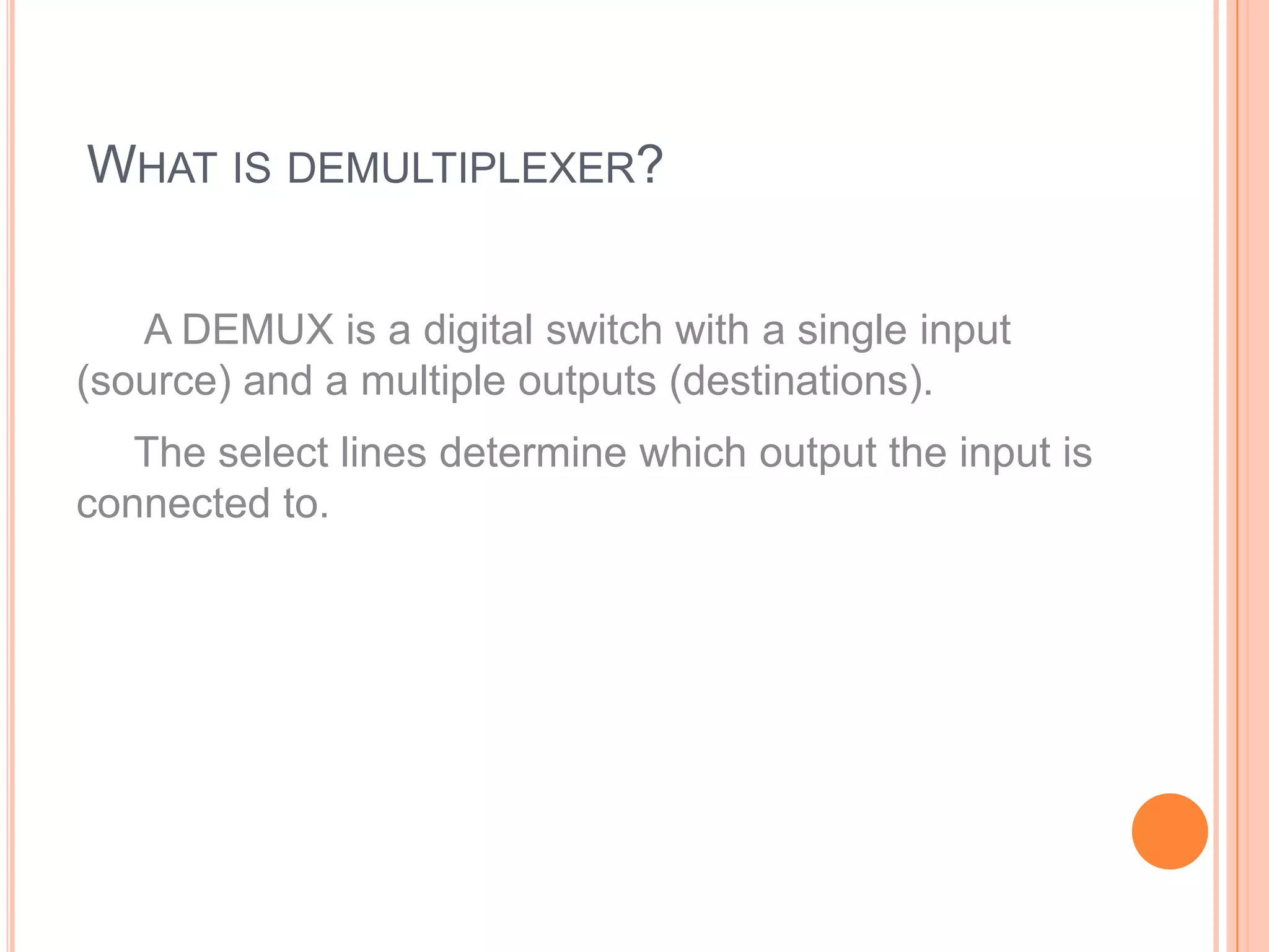 A demux is a digital switch that takes a single input signal and distributes it to multiple outputs based on select lines. It has one input and multiple outputs, with the select lines determining which output the input is routed to. Common demux configurations include 1-to-2, 1-to-4, 1-to-8, and 1-to-16 depending on the number of select lines. A typical application is routing a single data source like a laser printer to multiple destinations like a fax machine, inkjet printer, or plotter.