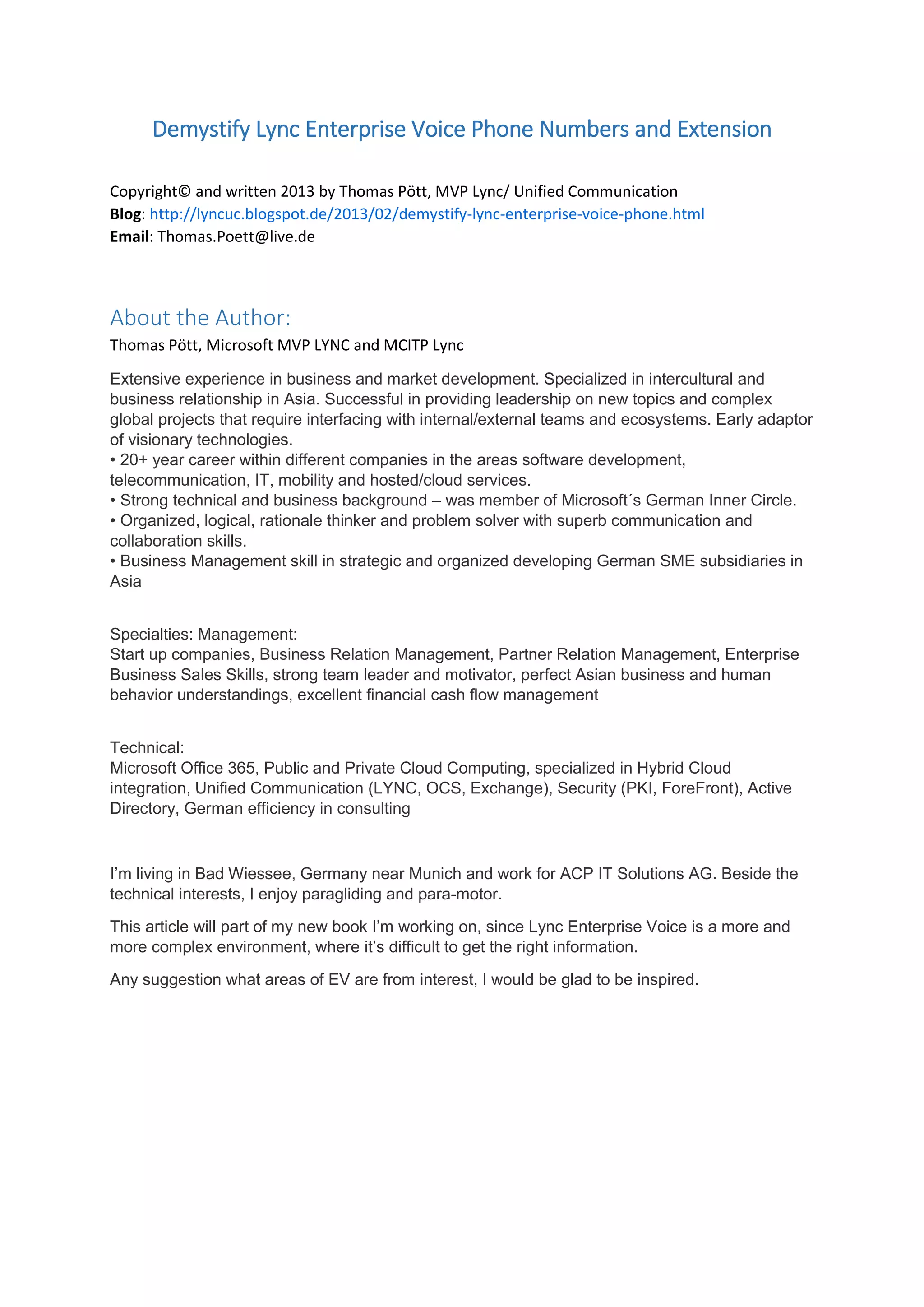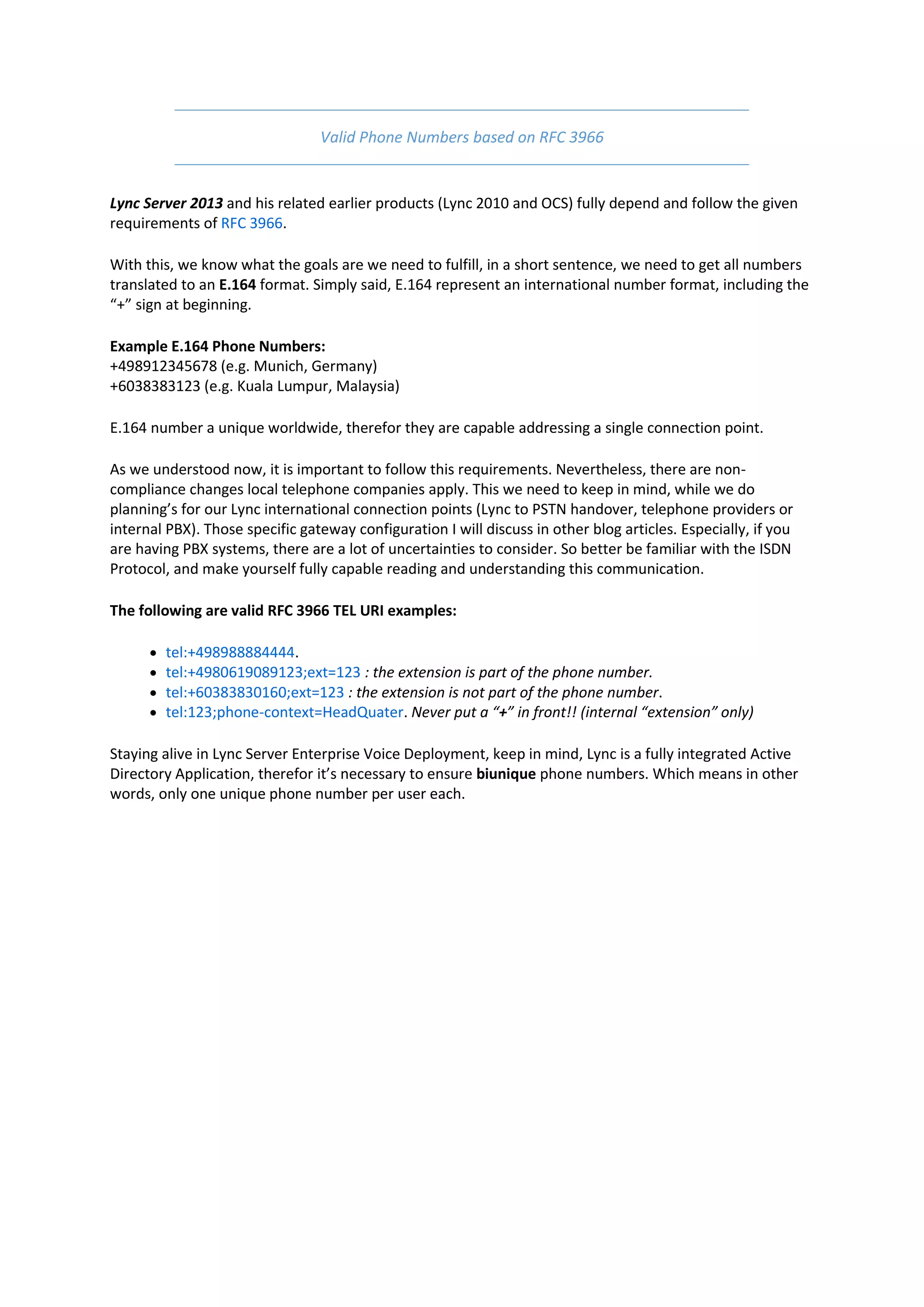 The document discusses the complexities of deploying Lync Enterprise Voice, focusing on phone number formats, specifically e.164 and RFC 3966 compliance, and the importance of unique phone numbers for users. It details the challenges of integration with PBX systems and highlights best practices for caller ID handling and dial plans for seamless communication. Additionally, it emphasizes the necessity of extensions for user authentication in conferencing and UC phone scenarios.