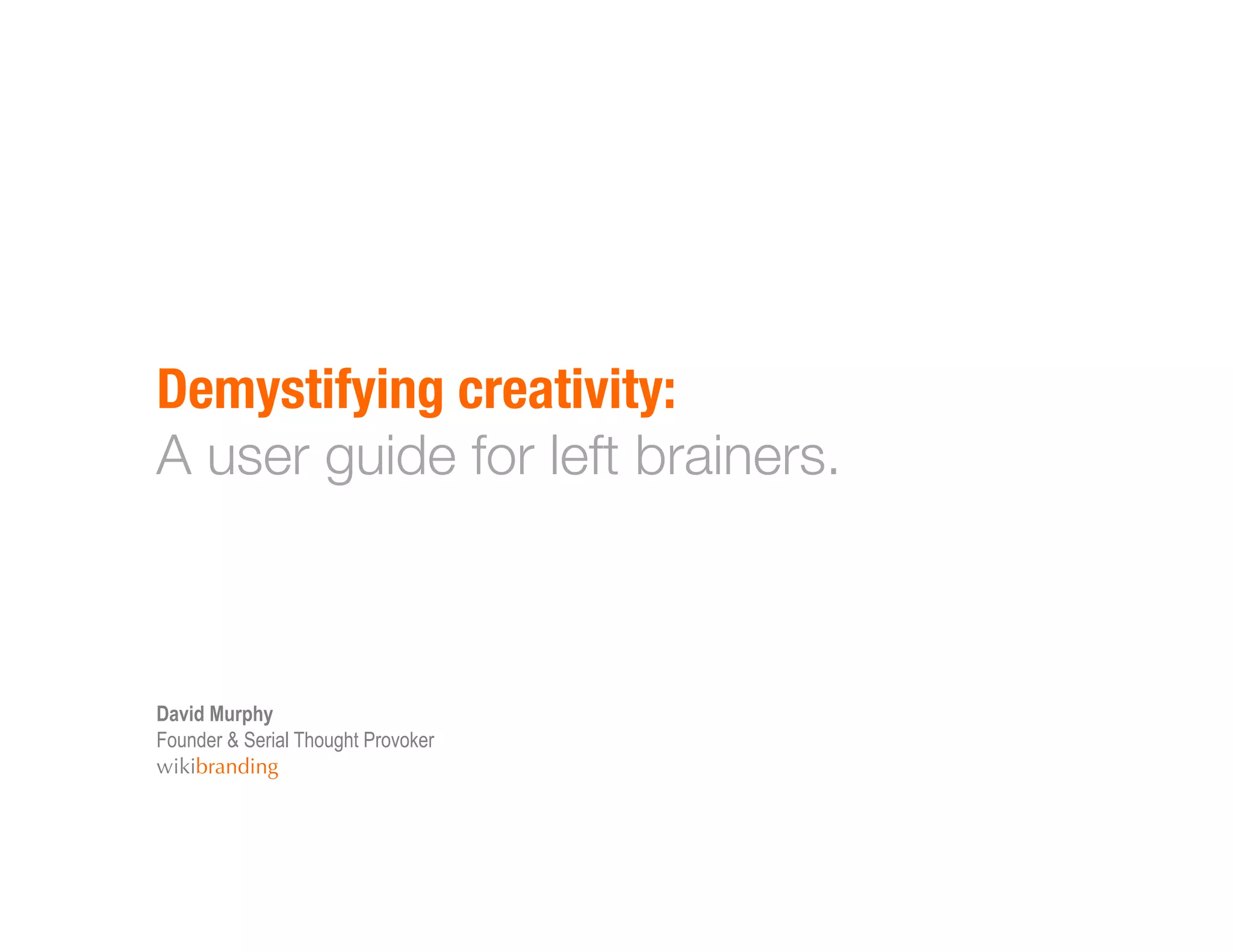 The document provides a framework for creative problem solving aimed at "left brainers". It begins by addressing common refrains from left-brainers that they are not creative. The goals are then to demystify creativity and provide a useful framework. This framework involves four steps: Define, Know, Collaborate, and Invert. Various techniques are described for each step, such as using the "five whys" to get to the root problem, gathering relevant knowledge from three categories, using a "six hat" team approach, and thinking about the problem from different perspectives. The document argues that creativity comes from structured processes and knowledge rather than being random or a "hollow exhortation".