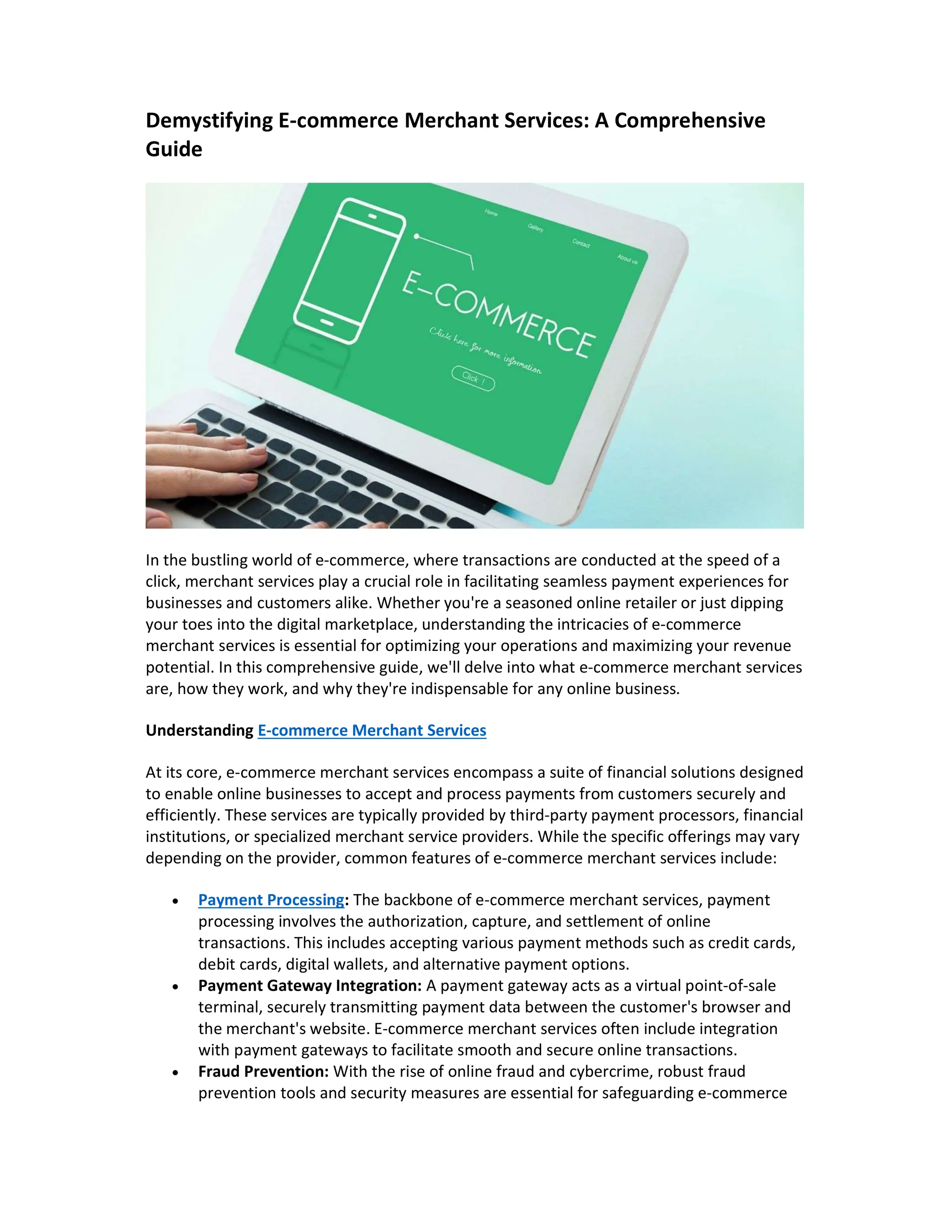 This document is a comprehensive guide on e-commerce merchant services, which are essential for online businesses to securely and efficiently process payments. It covers the core functionalities, like payment processing and fraud prevention, and emphasizes the importance of selecting the right service provider based on features, security, cost, and support. Ultimately, understanding these services can optimize operations and enhance the customer experience in the digital marketplace.