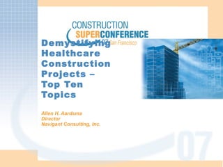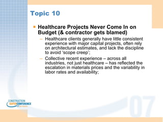 This document summarizes 10 topics related to challenges in healthcare construction projects. It discusses how healthcare clients have little experience managing major capital projects which often leads to budgets not being met due to scope creep. It also notes that healthcare executives have trouble making timely decisions due to various stakeholders needing consensus. Additionally, decisions on major medical equipment are often made late in the construction process, leading to higher change orders.