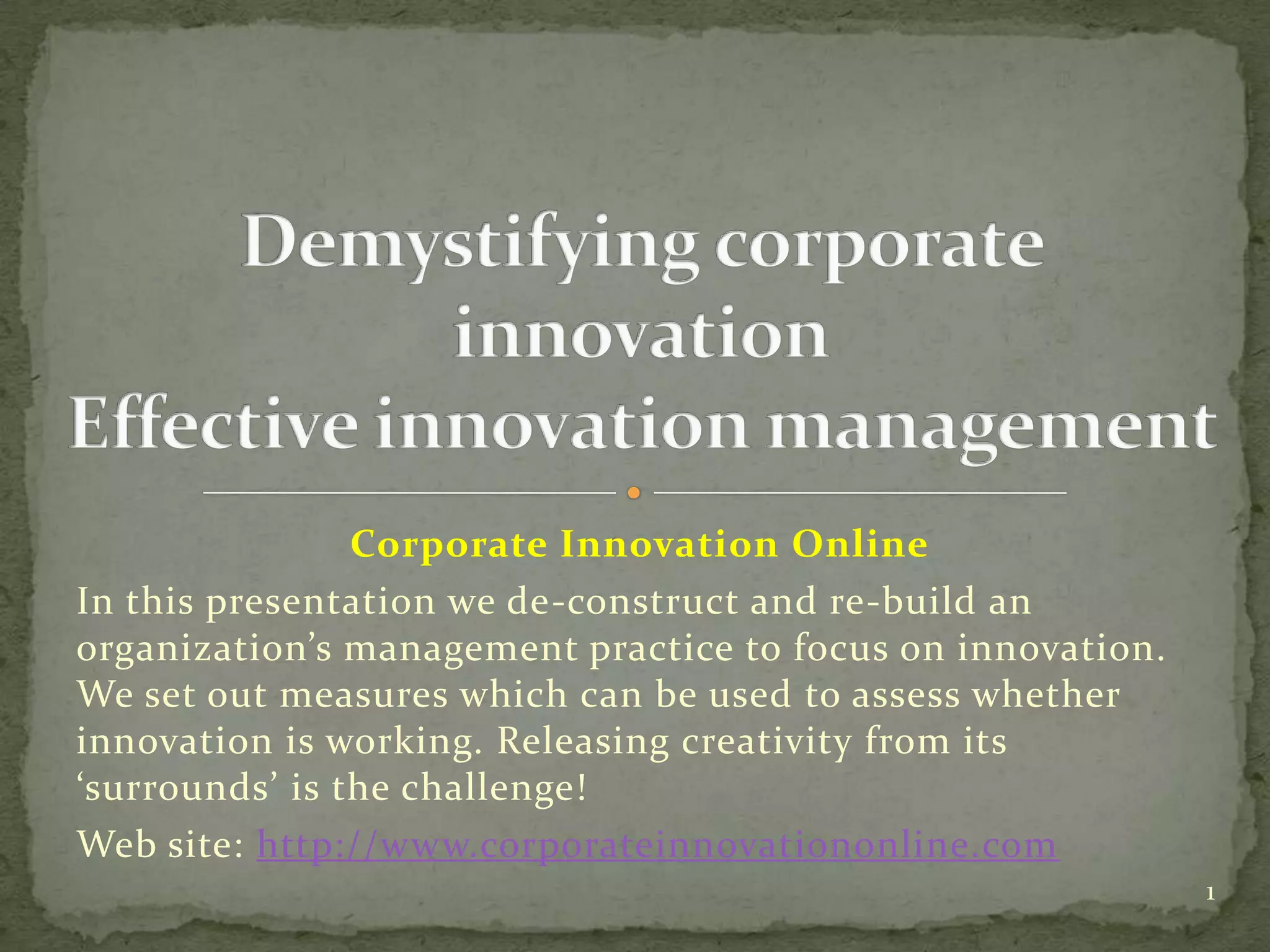 The document discusses the importance of restructuring management practices to foster corporate innovation, with a focus on creativity as a central yet often misunderstood element. It highlights specific management practices that can enhance innovativeness, such as strong leadership, effective organization of daily operations, and supportive idea generation processes. Measurement and assessment of innovation effectiveness are emphasized as critical for understanding and improving corporate innovativeness.
