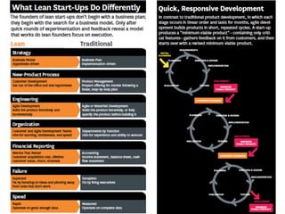 The document discusses the lean startup model, emphasizing its scientific approach to creating and managing startups under conditions of extreme uncertainty. It highlights the importance of validated learning, customer feedback, and iterative design over traditional methods, arguing that startups should focus on experimentation and minimal viable products (MVPs). Additionally, it critiques common practices in startups and outlines how the lean methodology can lead to more sustainable business growth.
