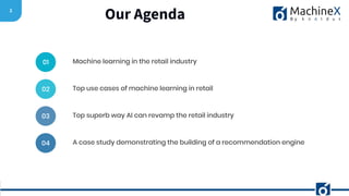 The document discusses how machine learning is transforming the retail industry through various applications such as inventory management, price adjustment, and customer support chatbots. It highlights specific use cases, including demand forecasting and virtual fitting rooms, and presents Knoldus Inc.'s expertise in leveraging AI technologies for competitive advantage. Additionally, it emphasizes the continuous development and contribution to open source technologies in the field.