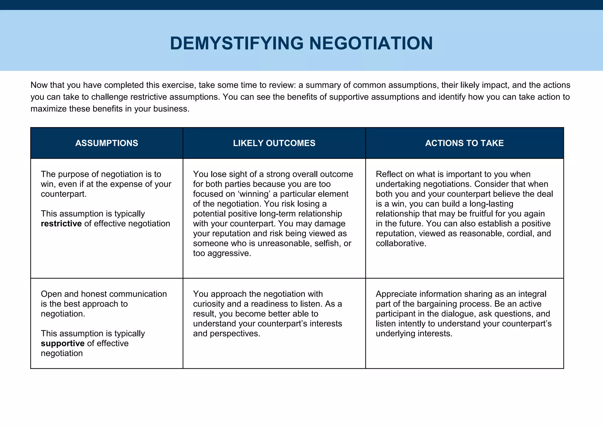 This document discusses common assumptions in negotiation and their likely impact. It provides actions that can be taken to challenge restrictive assumptions and maximize the benefits of supportive assumptions. Some key assumptions discussed include: the purpose of negotiation is to win at any cost, which risks damaging relationships; open communication allows understanding of different perspectives; negotiation does not need to be adversarial as win-win solutions are possible; and a counterpart's first offer is not necessarily their best or final offer. The document recommends considering the interests of both parties, building rapport, and taking a collaborative, long-term approach to find mutually beneficial outcomes.