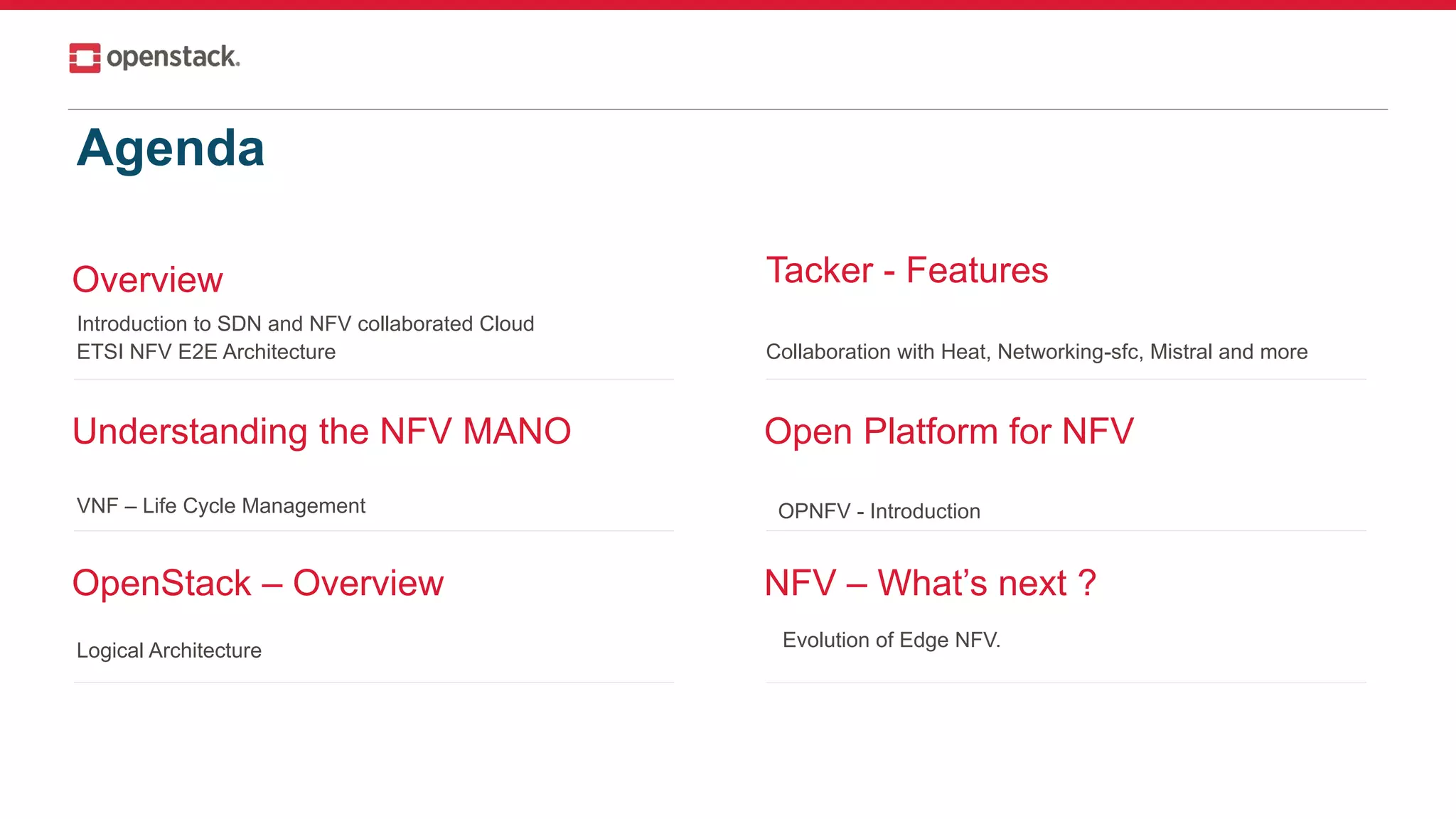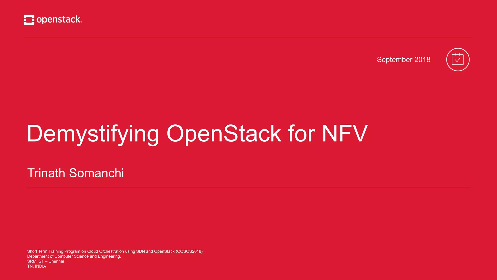 The document provides an overview of demystifying OpenStack for NFV. It discusses ETSI NFV architecture, OpenStack components relevant to NFV such as Tacker, Neutron, Heat, Ceilometer, and how they work together to provide NFV capabilities. It also summarizes key NFV concepts like VNF lifecycle management, service function chaining using networking-sfc, and how monitoring is implemented using Ceilometer.