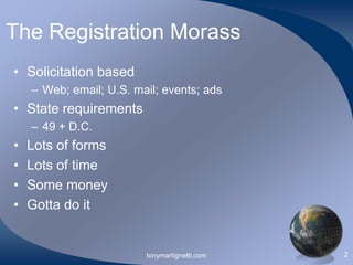 The document outlines the complexities of state charity registration for fundraising activities, highlighting the need for compliance across various states in the U.S. It discusses the implications of failing to register, including potential legal liabilities and the importance of following proper procedures. Additionally, it provides guidance on how to begin the registration process and resources for further information.
