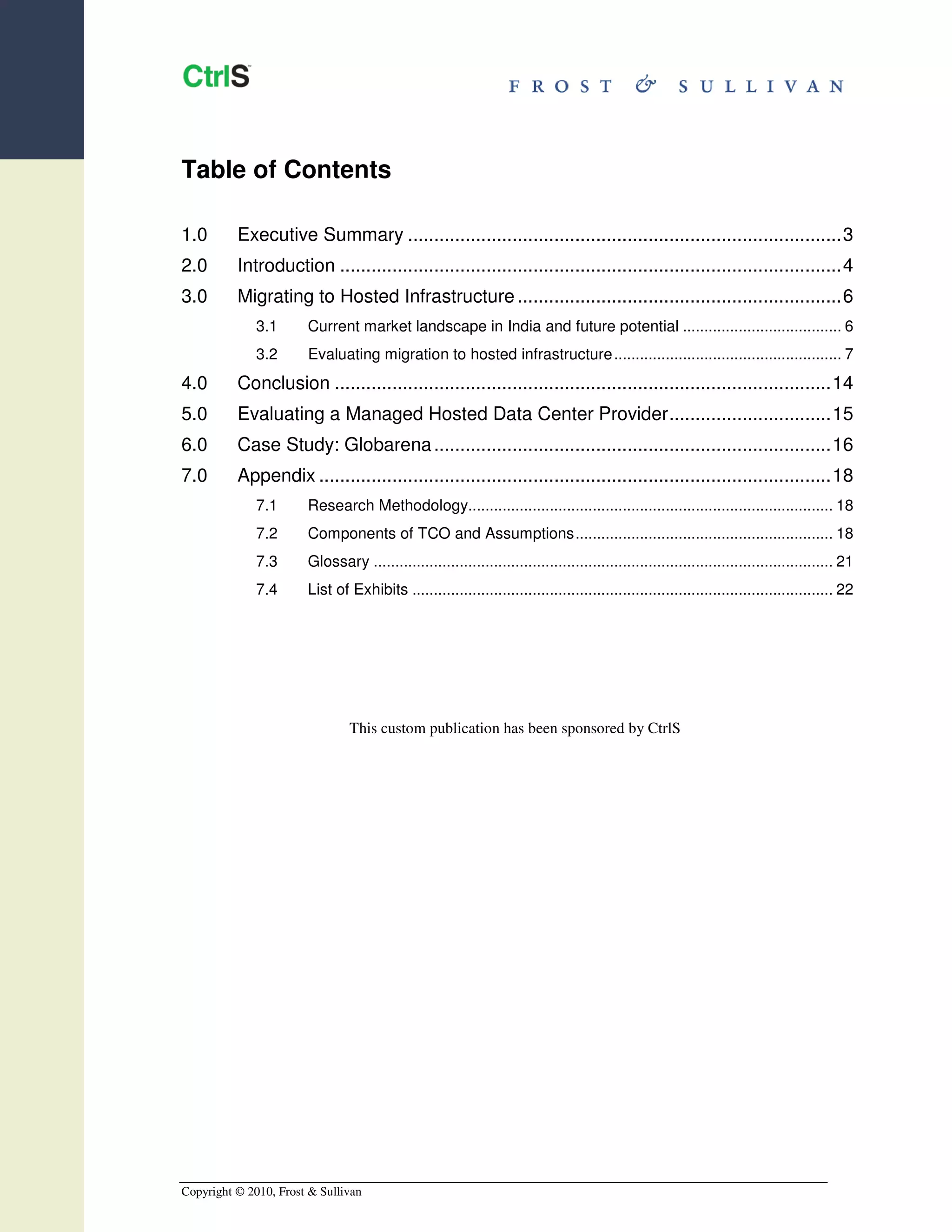This whitepaper evaluates the benefits of migrating to managed hosted data center infrastructure, particularly for small and medium businesses (SMBs) in India, highlighting significant cost savings, enhanced flexibility, and reduced management complexity. Through a Total Cost of Ownership (TCO) framework, it demonstrates that managed hosting can lead to over 26% savings compared to in-house deployment while providing increased reliability and minimized over-provisioning. The document also emphasizes the importance of selecting a competent service provider to maximize the advantages of hosted infrastructure.